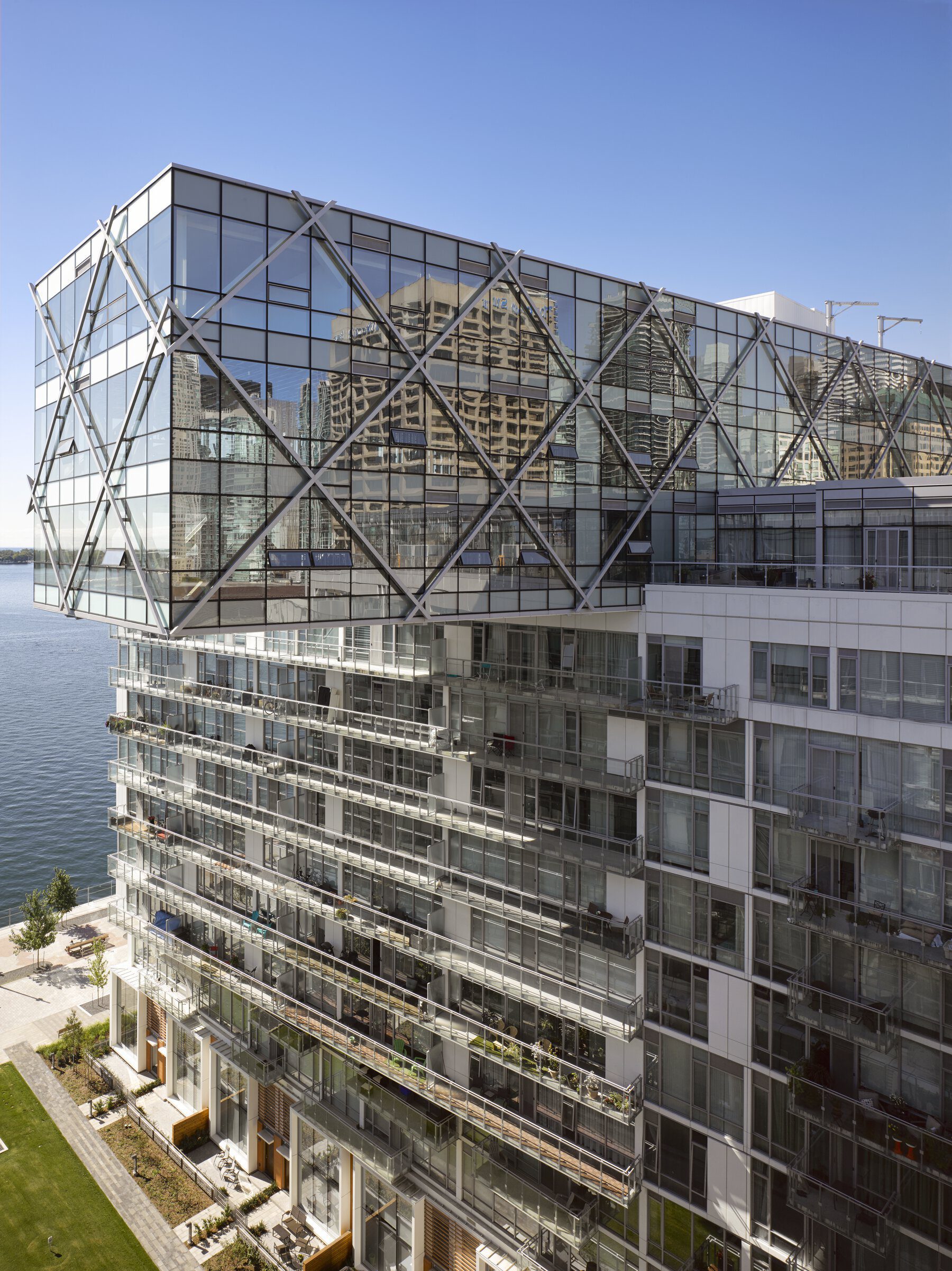 Les quatre bâtiments articulés sont disposés par paires sur un axe nord-sud. Chaque paire de piles est reliée par un « pont » en porte-à -faux de trois étages qui évoque les portiques utilisés pour charger et décharger les navires dans le port de Toronto. « Les ponts sont essentiellement d’énormes fermes d’acier qui se cantonnent à chaque extrémité des piles », a expliqué Pia Heine.