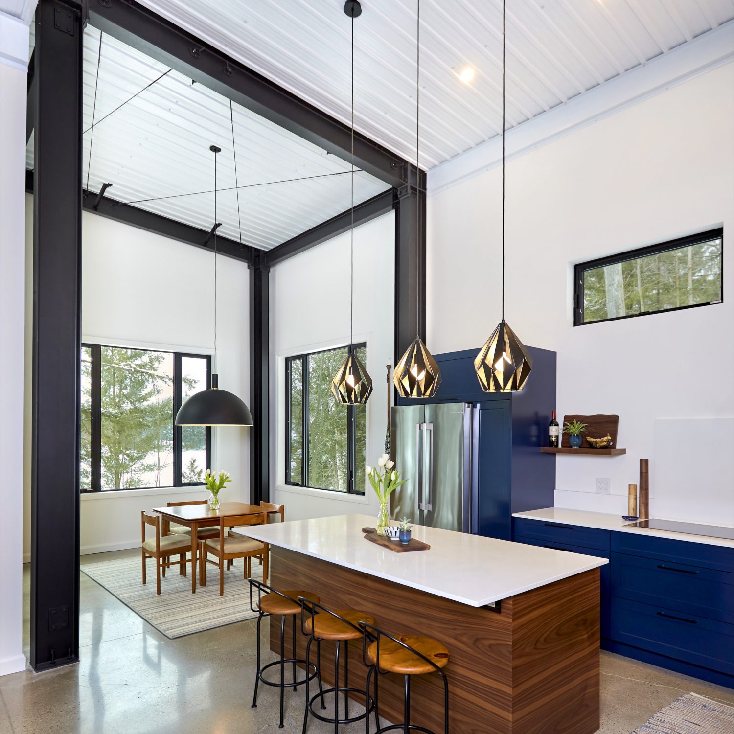 Miyanishi and Thorne elected to combine two buildings to make their new cottage. They chose two monoslope designs, which Prestige installed perpendicular to each other. The structure forms an L, sheltering an outdoor living area. In the short arm of the L, the kitchen and dining area project out toward the lake with nearly 14-foot ceilings. Like the Latimers, they opted for large windows that bring the outside in, blurring the division between the cottage and its surroundings.
